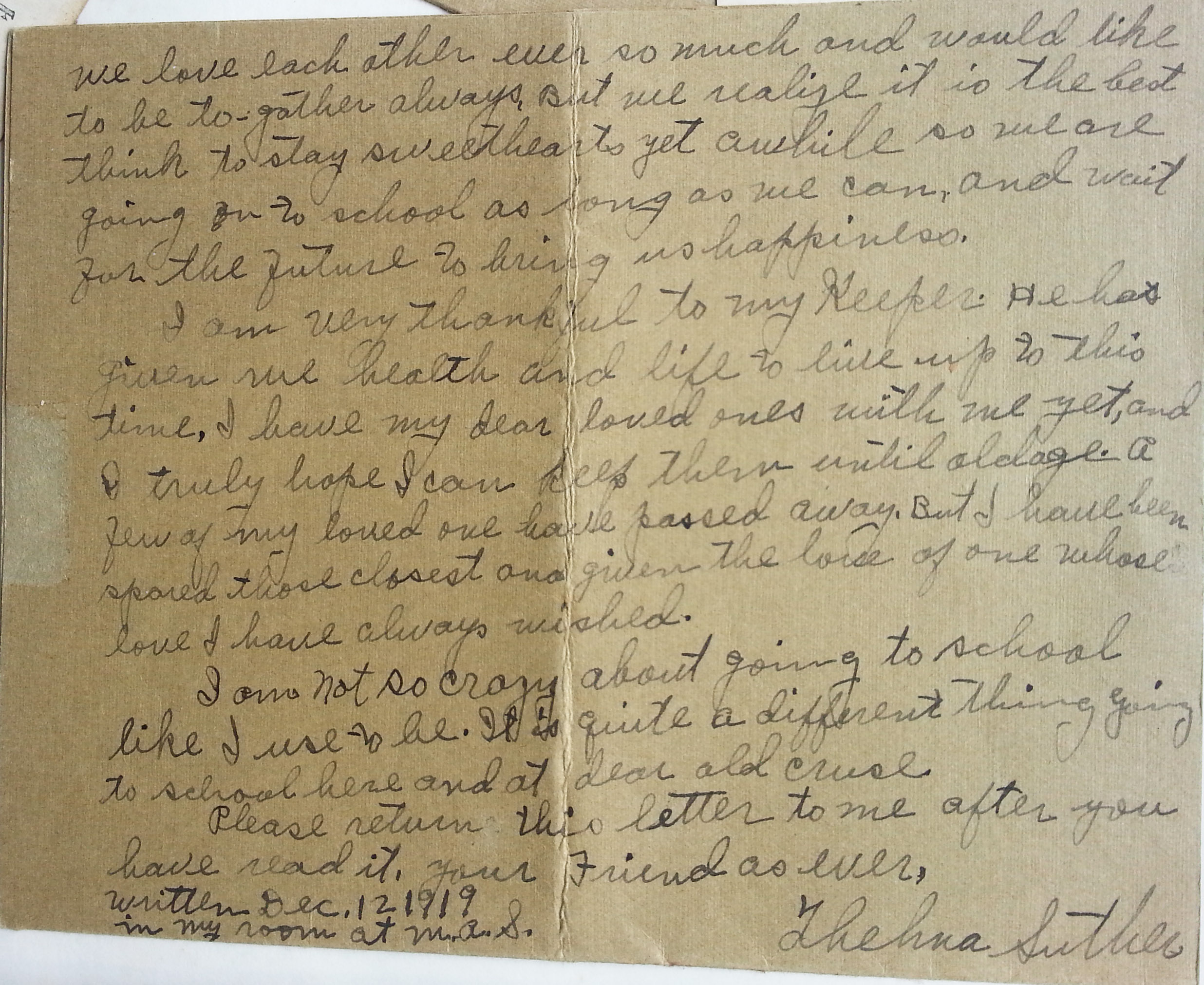 Letter from Thelma Suther to friend Ruth (Cress?) while still students at Mont Amoena, 12 Dec 1919.