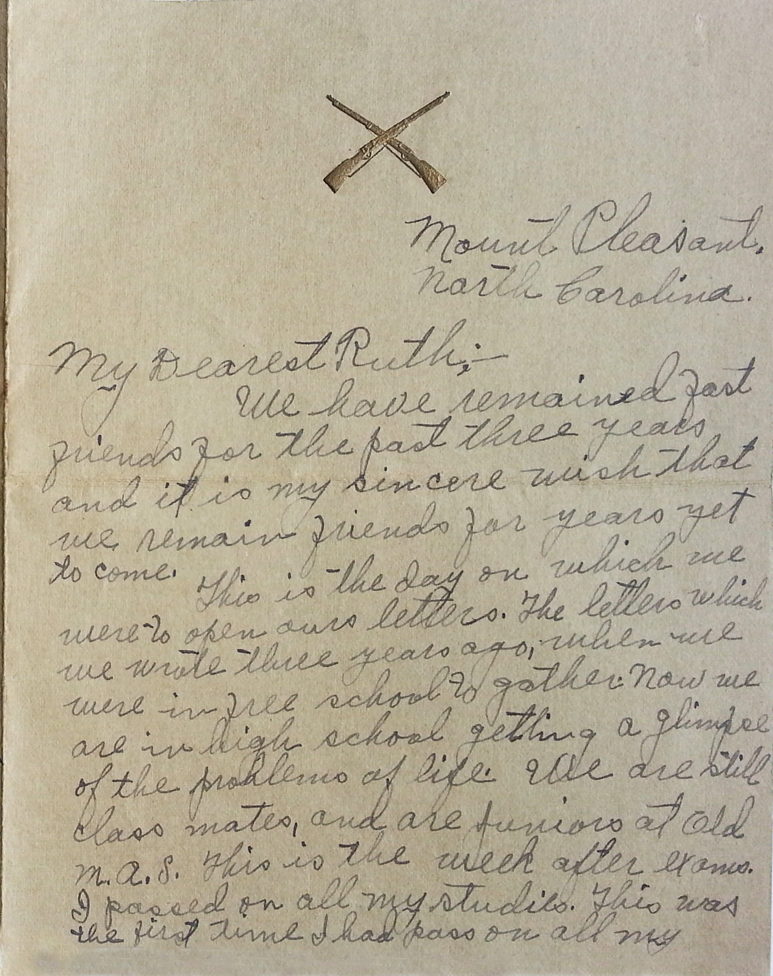 This is the day on which we were to open our letters. The letters which we wrote three years ago, when we were in free school together. Now we are in high school getting a glimpse of the problems of life. We are still class mates, and are juniors at old M. A. S. This is the week after exams. I passed on all my studies. This was the first time I had pass on all my examinations at the end of the school term. It had been my luck to always fail on some exam (it was spelling examination). I like college life very well the chief trouble is “grub” these days. My work is hard but I like it, and do not want to give any of it up. English is my best liked study. Geometry and Physics are my hardest.