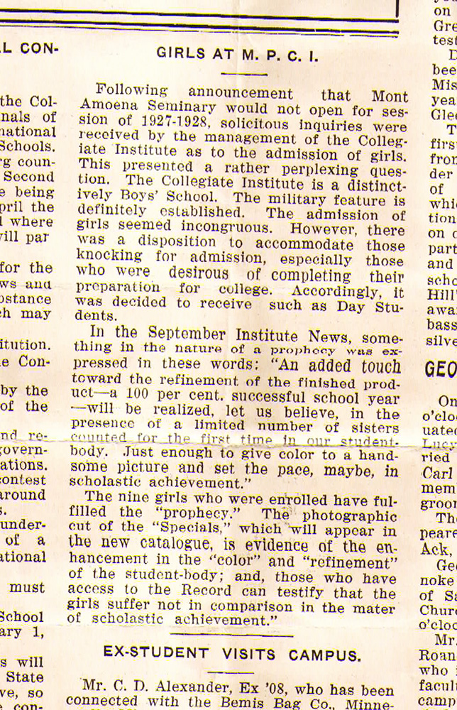 An article from unknown newspaper about the 1927 final joint graduation ceremony of Mont Ameona and Mount Pleasant Collegiate Institute.