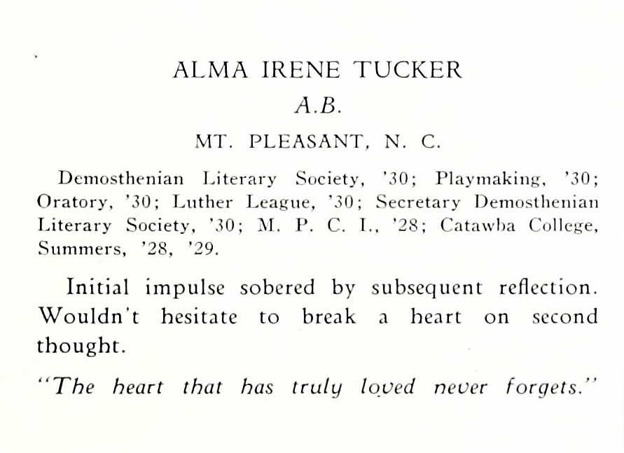 Tucker, Alma, Lenoir Rhyne 1930-2 Published June 30, 2015 at 891 × 647 in Tucker, Alma Irene ← Previous Next → Alma Irene Tucker, Lenoir Rhyne College, 1930.