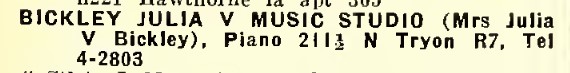 She operated the Julia V. Bickley Music and Voice Studio for a number of years and was president of the Piano Teacher’s Forum of Charlotte.