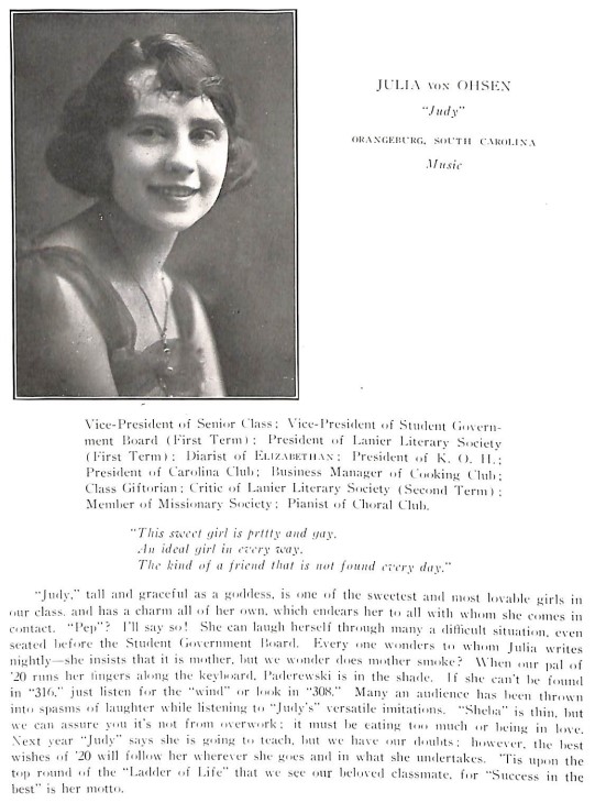 Orangeburg, July 20 – In the presence of a few friends Miss Julia Von Ohsen became the bride of J. Eugene Bickley Monday afternoon at 4 o’clock at the Methodist parsonage, the Rev. T. G. Herbert officiating. After the ceremony the bridal party went to the home of Mrs. George Dorrill on Whitman street, where refreshments were served. Mr. and Mrs. Bickey left shortly afterward in their car for a trip to the mountains of North Carolina.